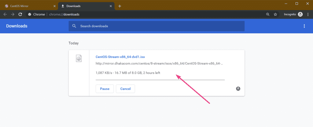 Your browser should start downloading CentOS 8 Stream DVD ISO installation image. It may take a long time to finish.
