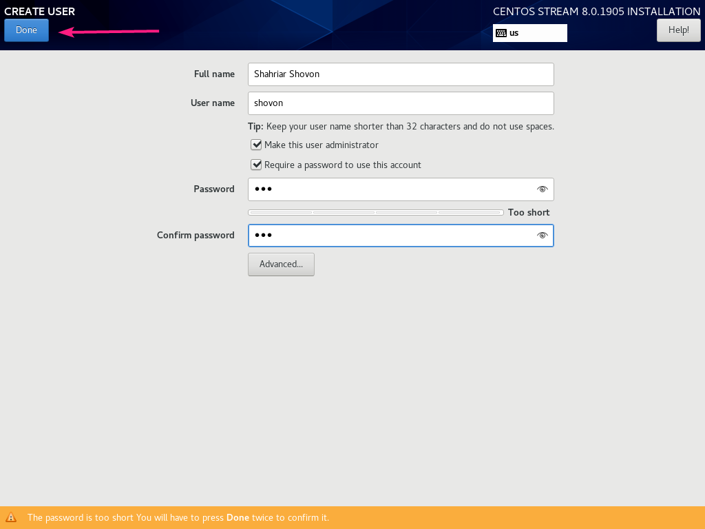 NOTE: If you’re using short/simple password, you may need to click on Done twice to confirm that you really want this.