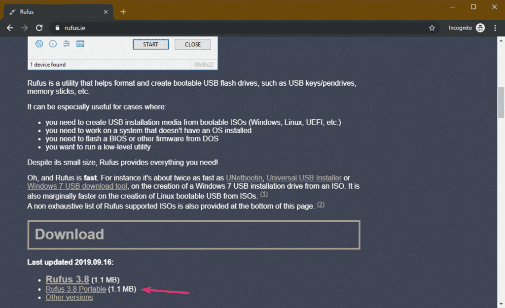 First, visit the official website of Rufus. Once the page loads, click on the Rufus Portable link as marked in the screenshot below. Rufus should be downloaded.