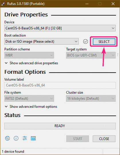 Now, insert a USB thumb drive and run Rufus. Then, click on SELECT.