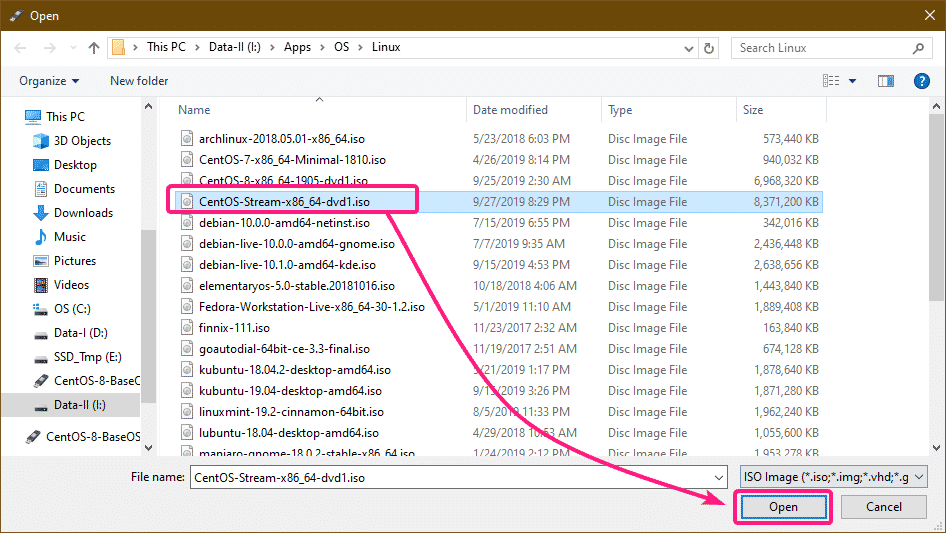 Now, select the CentOS 8 Stream ISO installation image and click on Open.