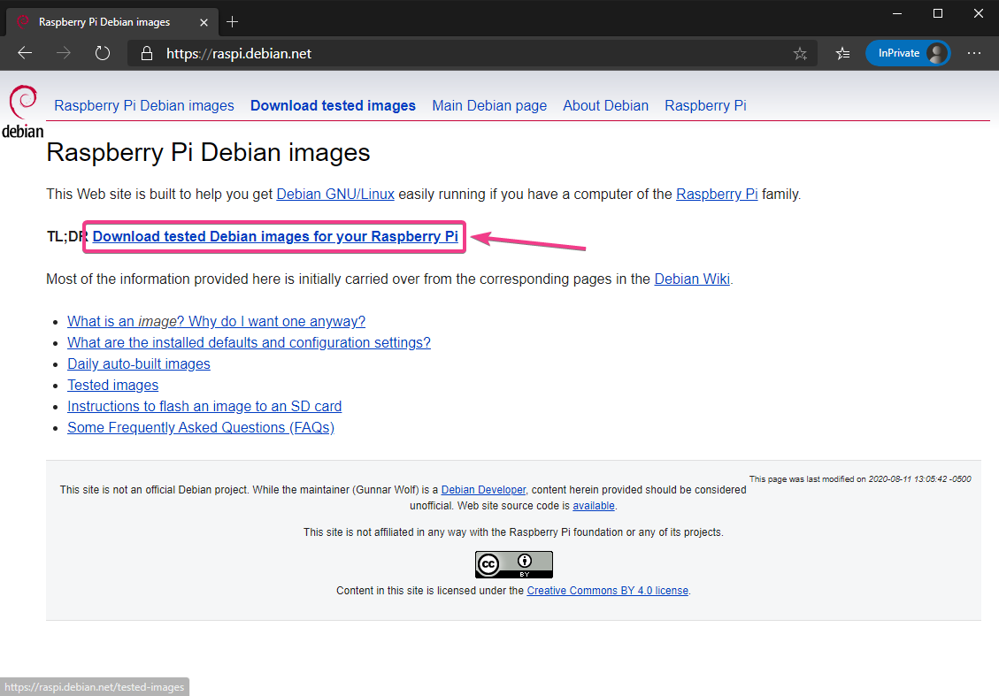 First, visit the official Debian for Raspberry Pi website from your favorite web browser. Once the page loads, click on Download tested Debian images for your Raspberry Pi as marked in the screenshot below.
