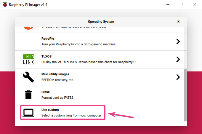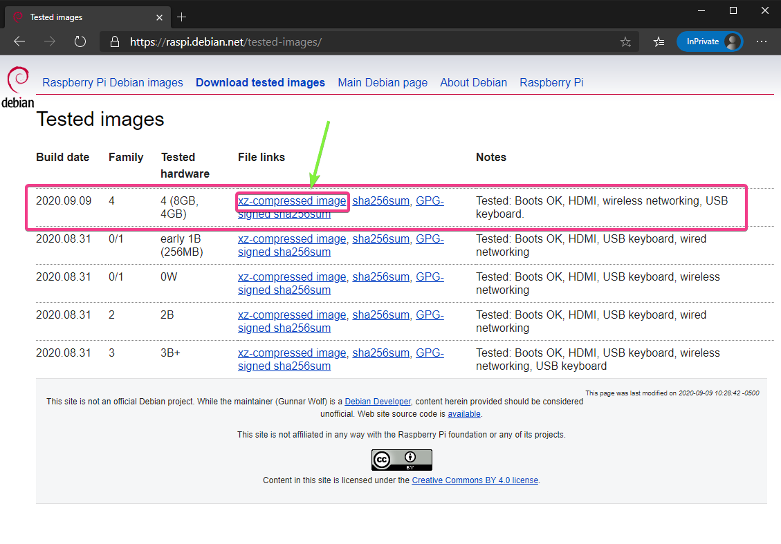 Click on the xz-compressed image link (Raspberry Pi 4 or Family 4) as marked in the screenshot below.