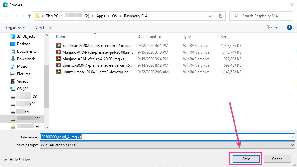 Your browser should prompt you to save the Debian Raspberry Pi 4 image. Select a directory where you want to save the image and click on Save.