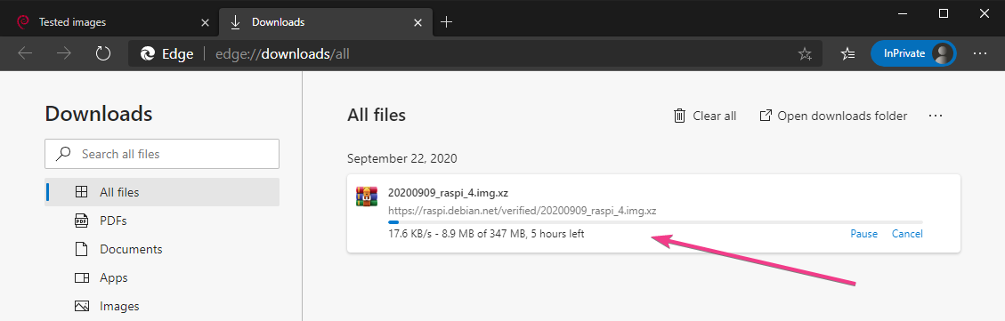 Your browser should start downloading the Debian Raspberry Pi 4 image. It may take a while to complete.