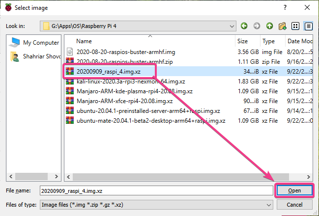 Select the Debian Raspberry Pi image that you have just downloaded and click on Open.