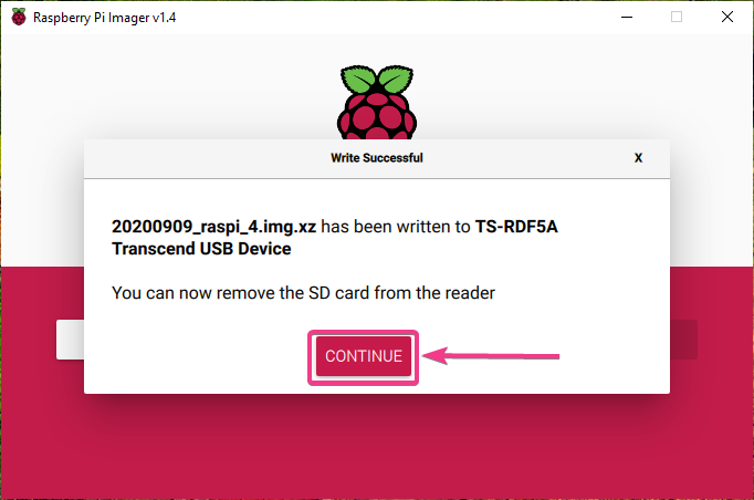 At this point, the Debian Raspberry Pi image should be flashed on to the microSD card. Click on CONTINUE and close Raspberry Pi Imager. Then, remove the microSD card from your computer.