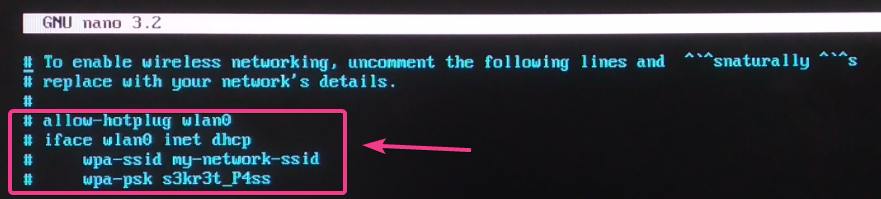 Once you’re done, press <Ctrl> + X followed by Y and <Enter> to save the /etc/network/interfaces.d/wlan0 configuration file.