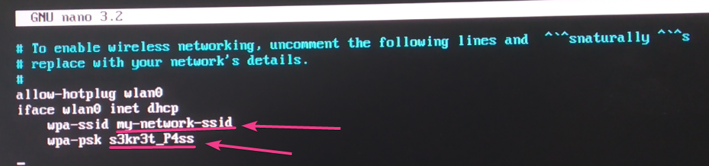 Change the wpa-ssid to your Wi-Fi SSID and wpa-psk to your Wi-Fi password.