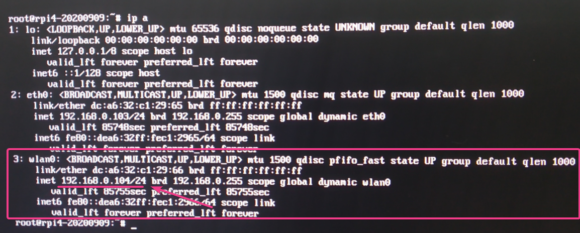 Once your Raspberry Pi 4 boots, your wireless network interface wlan0 should automatically connect to your desired Wi-Fi network and receive an IP address via DHCP. In my case, the IP address is 192.168.0.104. It will be different for you. So, make sure to replace it with yours from now on.
