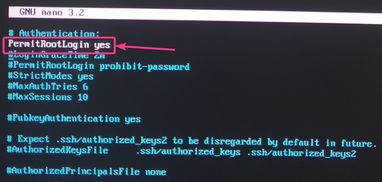 In the # Authentication section, add the line PermitRootLogin yes as marked in the screenshot below.