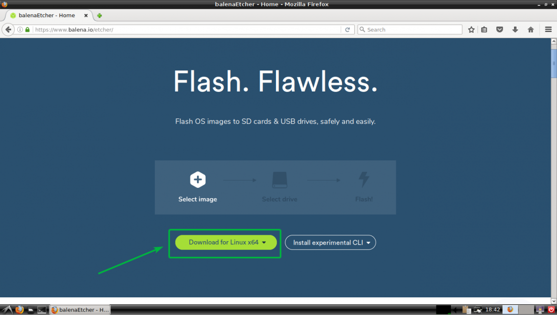 You can download Etcher from the official website of Etcher. First, go to the official website of Etcher at https://www.balena.io/etcher/ and you should see the following page. You can click on the download link as marked in the screenshot below to download Etcher for Linux but it may not work all the time. It did not work for me.
