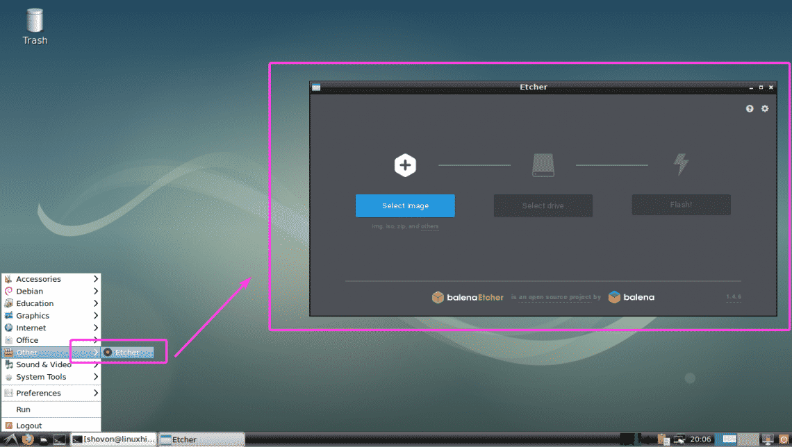 Now, you don’t have to start Etcher from the command line anymore. You can start Etcher from the Application Menu as you can see in the screenshot below.