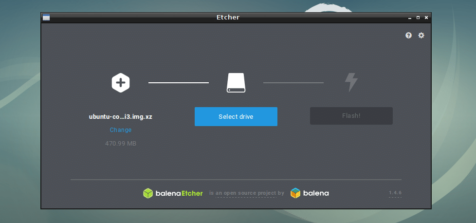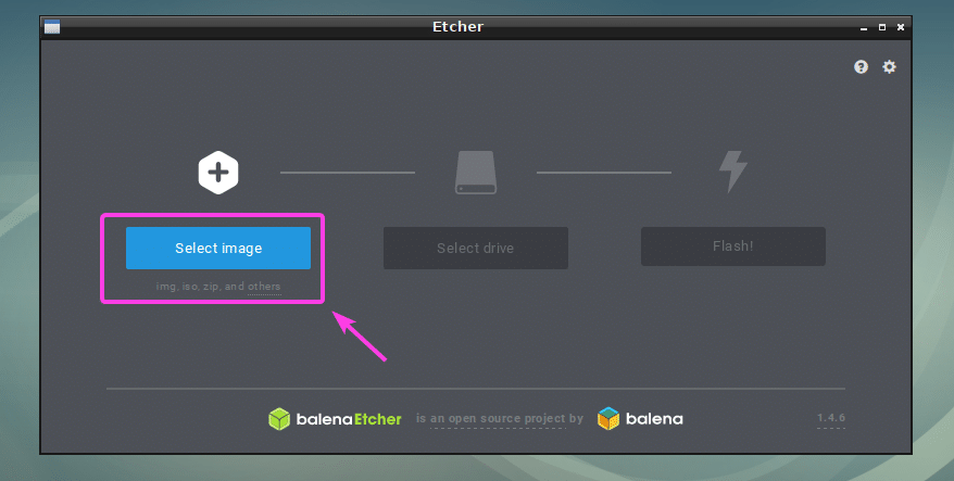 You can now flash microSD cards using Etcher for your Raspberry Pi. First, open Etcher and click on Select image.