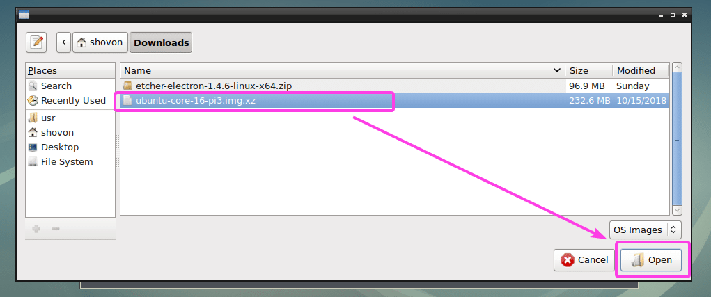 A file picker should be opened. Now, select the operating system image file that you want to flash your microSD card with and click on Open.