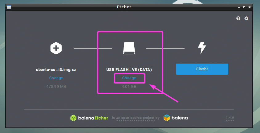 Now, insert the microSD card or USB storage device that you want to flash with Etcher. It may be selected by default. If you do have multiple USB storage devices or microSD card attached on your computer, and the right one is not selected by default, then you can click on Change as marked in the screenshot below to change it.