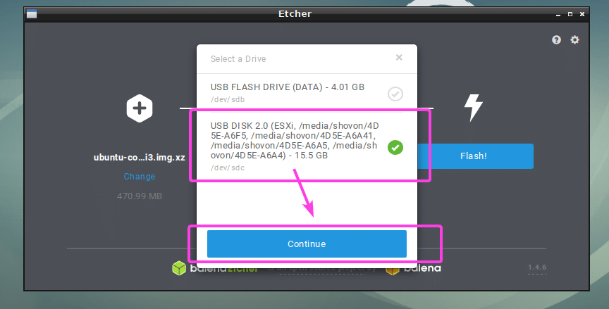 Now, select the one you want to flash using Etcher from the list and click on Continue.