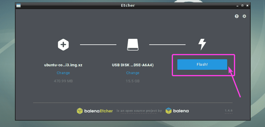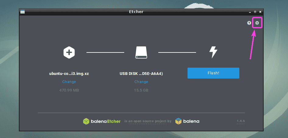You can also change Etcher settings to control how Etcher will flash the microSD cards or USB storage devices as well. To do that, click on the gear icon as marked in the screenshot below.