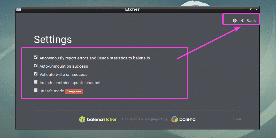 The Etcher settings panel is very clear and easy to use. All you have to do is either check or uncheck the things you want and click on the Back button. Normally you don’t have to do anything here. The default settings are good. But if you uncheck Validate write on success, it will save you a lot of time. Because this option will check if everything is written on the microSD cards or USB storage devices correctly. That puts a lot of stress on your microSD cards or USB devices and takes a lot of time to complete. Unless you have a faulty microSD card or USB storage device, unchecking this option would do you no harm. It’s up to you to decide what you want.
