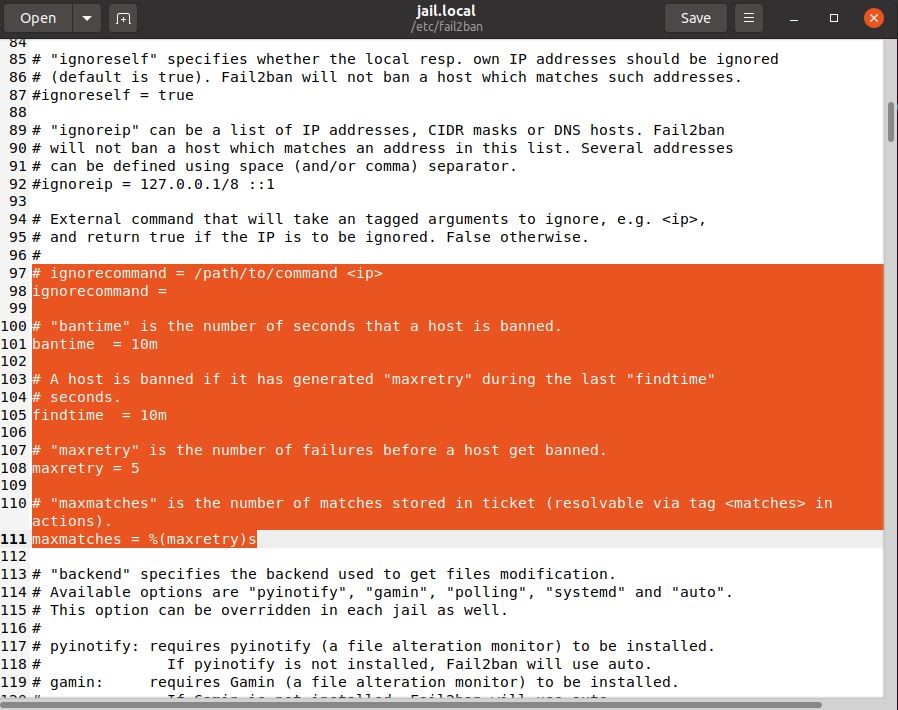 Lastly, there’s maxretry. It defines the exact number of failed login attempts allowed within the findtime. If the number of failed-authorization attempts within the findtime exceeds the maxretry value, the IP would be banned from logging back in. The default value is 5.