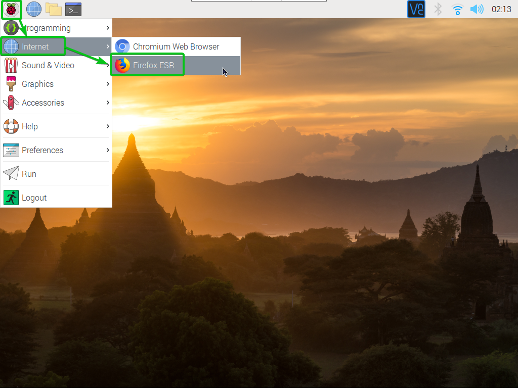 Once the Firefox web browser is installed, you can start Firefox from the Raspberry Pi OS Menu > Internet > Firefox ESR, as shown in the screenshot below.