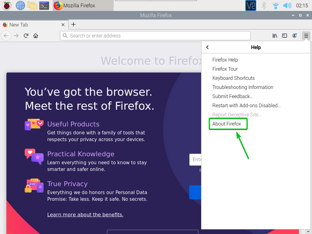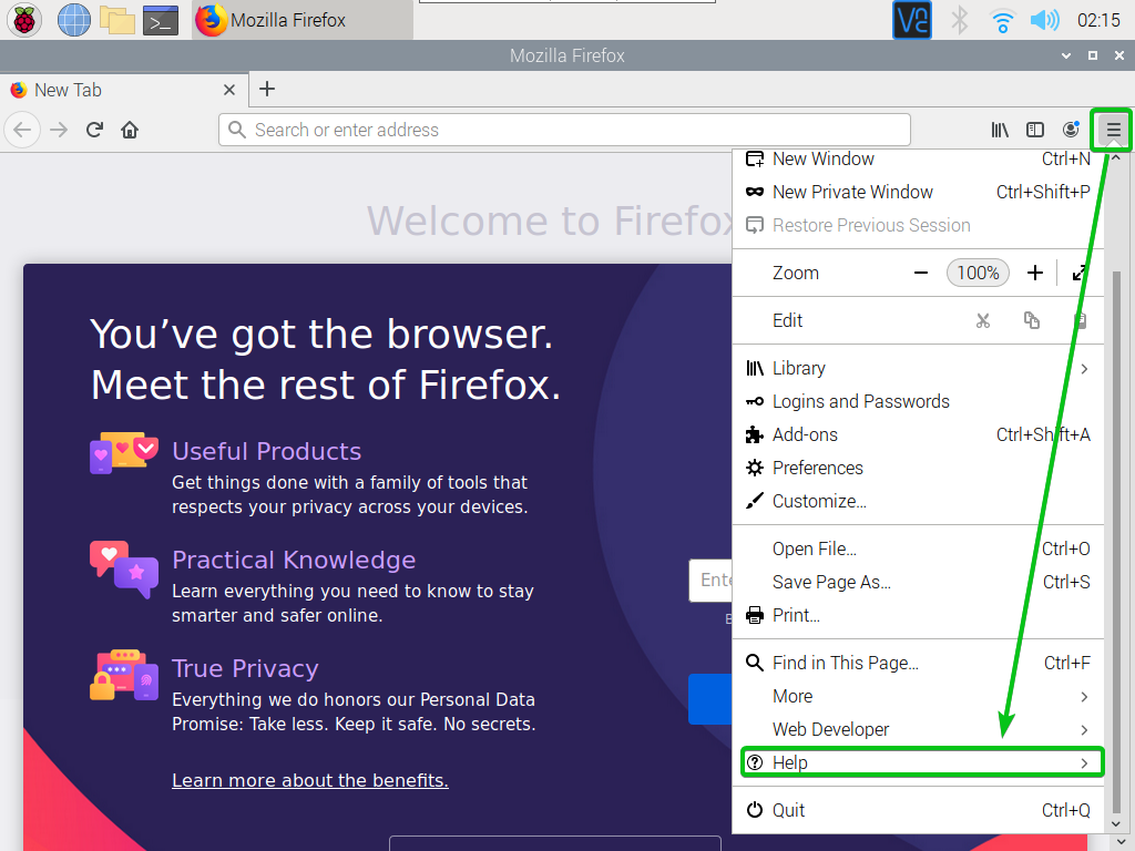 To see the version of the Firefox web browser you’re running, click on the hamburger menu () from the top right corner of the Firefox web browser and go to Help.