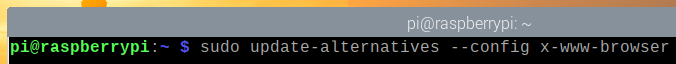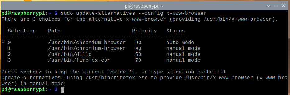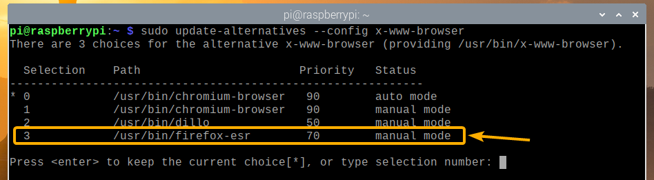 All the installed web browsers on your Raspberry Pi OS should be listed. Firefox web browser should be on the list. As you can see, the Firefox web browser has the selection number 3.