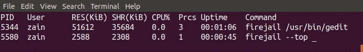 Alternatively, you can also run the top command along with firejail to display all the processes running under the firejail. Run the following command in the terminal window to display all the processes