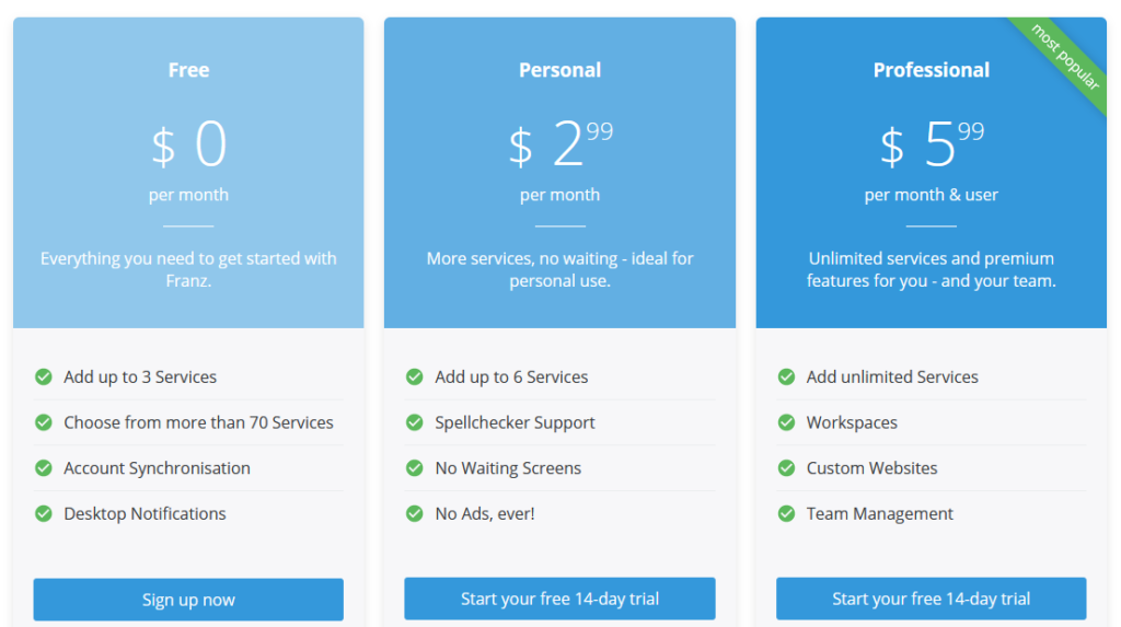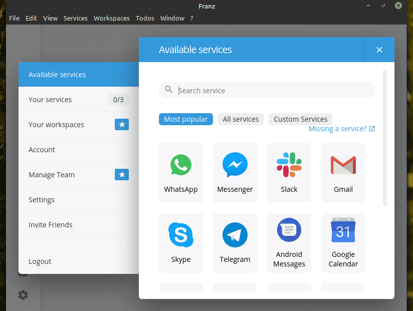 Now, Franz isn’t completely free-of-charge. Franz follows a freemium model where the “Free” edition offers simultaneous login up to 3 services. If you want more, then there’s “Personal” and “Professional” packages. Check out Franz pricing.