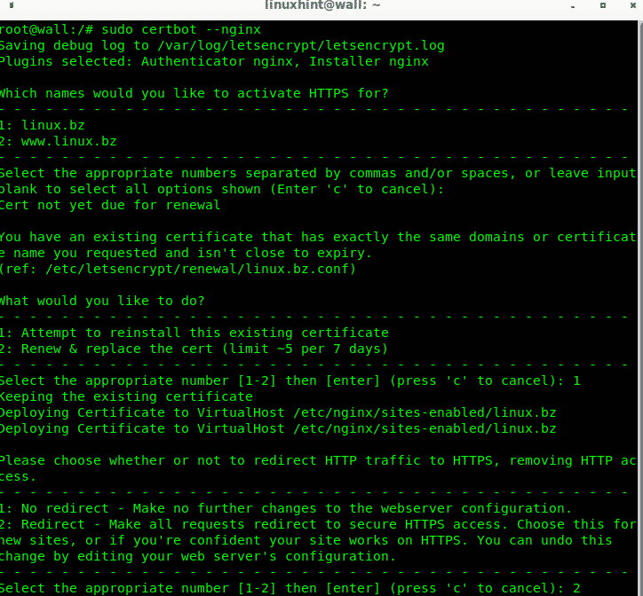You can fill all requested fields or leave them blank, the last step allows you to automatically configure Nginx to redirect all unsecure traffic through https.