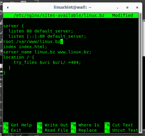 After adding the lines above (replacing linux.bz for your domain), press CTRL+X to save and exit the nano text editor.