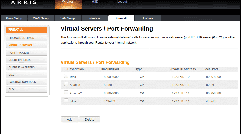 In order to allow access from outside the network, some home users will need to configure their routers to forward necessary ports to their web servers. The following image only shows an example of router configuration page for port forwarding, in your router you’ll need to forward ports 80 and 443 to your Apache computer local IP address.