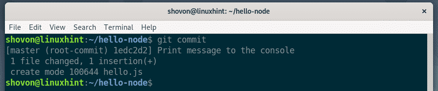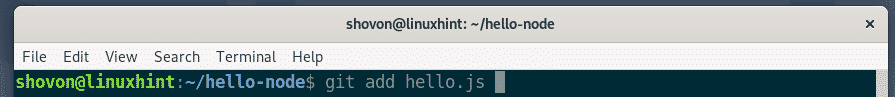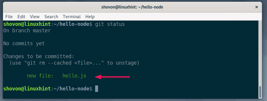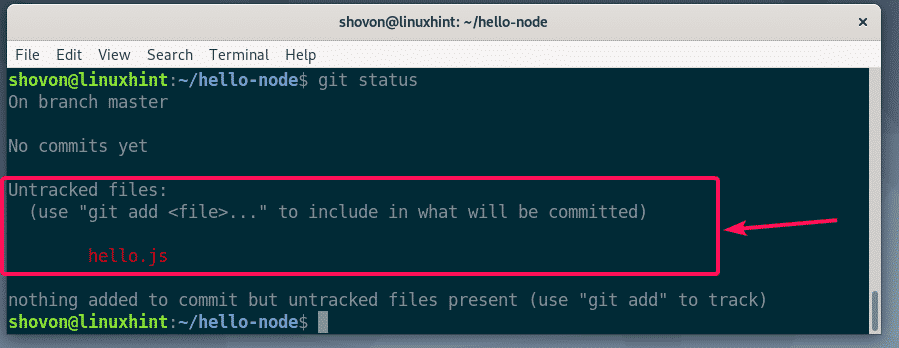 As you can see, the file hello.js is marked red. Which means it’s an untracked file.