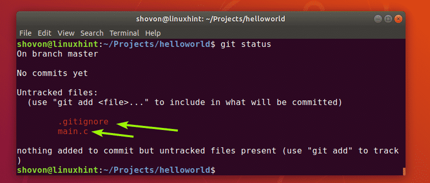 I also don’t have any commits yet. The source file main.c is an untracked file on the repository. This is the default status of all the newly created files of the Git repository.