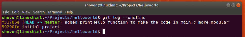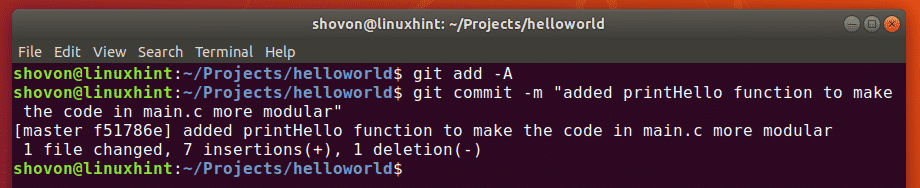 $ git commit -m "added printHello function to make the code in main.c more modular"