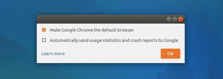 Once installation is finished, launch Google Chrome from Unity dashboard. On first launch following window will show up asking you if you want to make Google Chrome your default browser.
