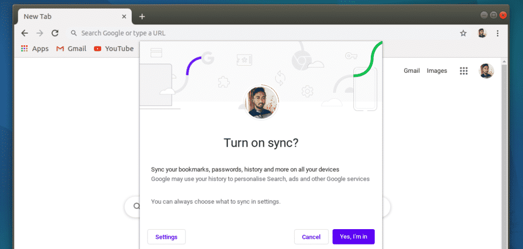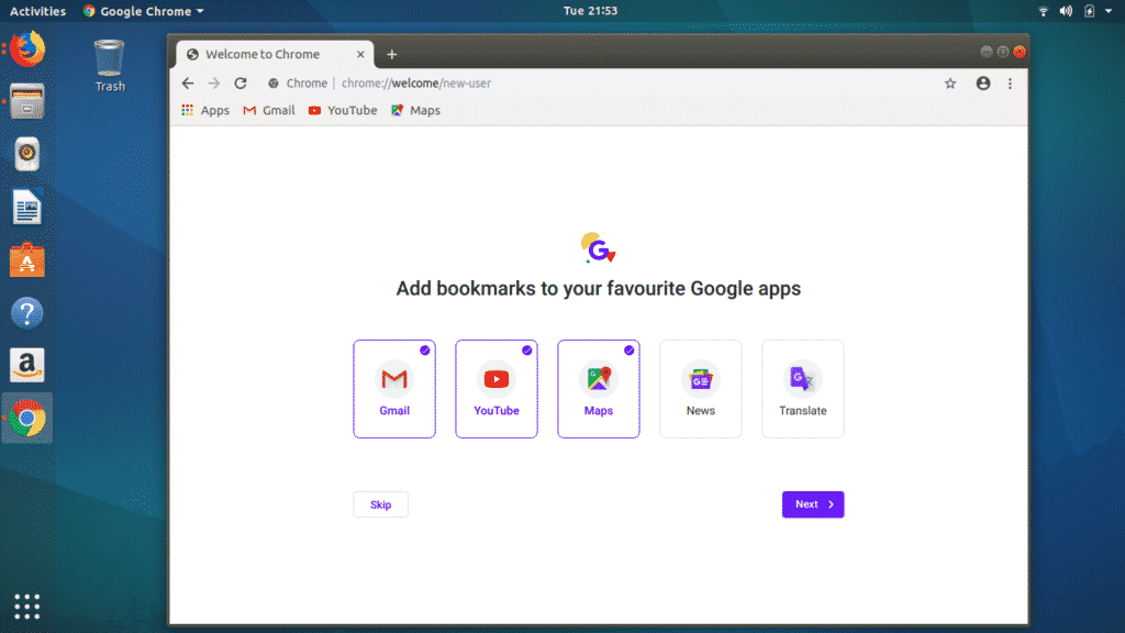 The apps you will select here will be added to bookmark for quick access. Next it will ask you if you want to sync Google data between your other devices and Chrome on Ubuntu.