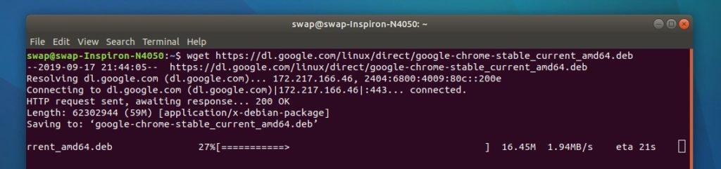 First off all you need to download DEB file from Google Chrome’s website to install on Ubuntu. Just open the Terminal and run the following link to start download process as shown in screenshot below.