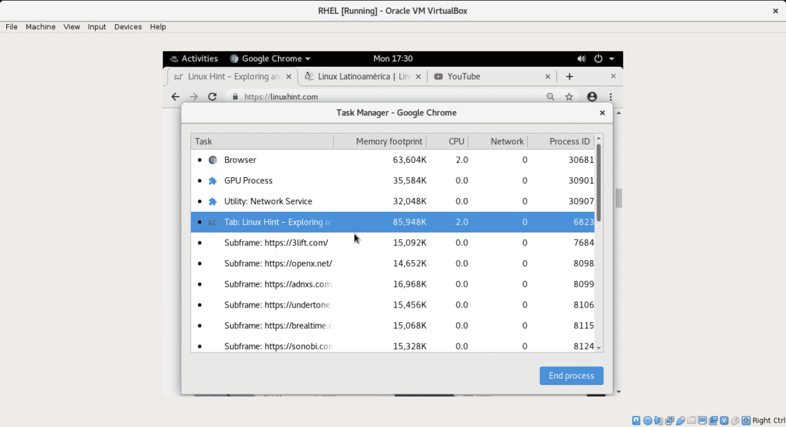 Google Chrome includes it’s own task manager to manage TABs processes. The task manager will show us CPU, network and memory usage by each Chrome’s tab. The task manager allows us to stop processes easily. To open Google Chrome’s task manager click on the main menu > More tools and Task Manager as shown in the following screenshot: