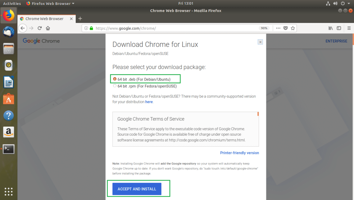 You should see the following dialog window. Select 64 bit .deb (For Debian/Ubuntu) and then click on ACCEPT AND INSTALL button as marked in the screenshot below.