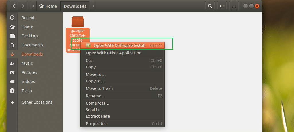 First open Nautilus File Manager and go to the ~/Downloads directory where you saved the Google Chrome installer .deb file.
