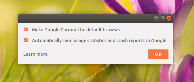 As you’re running Google Chrome for the first time, you should see the following window. You can uncheck Make Google Chrome the default browser if you don’t want to make Google Chrome the default browser. You can also uncheck Automatically send usage statistics and crash reports to Google if you don’t wish to send any statistics and crash reports to Google. Once you’re done deciding what you want, click on OK.