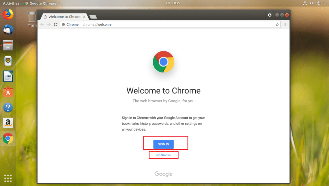 Google Chrome should start. You may click on SIGN IN to sign into your Google account, otherwise click on No thanks.