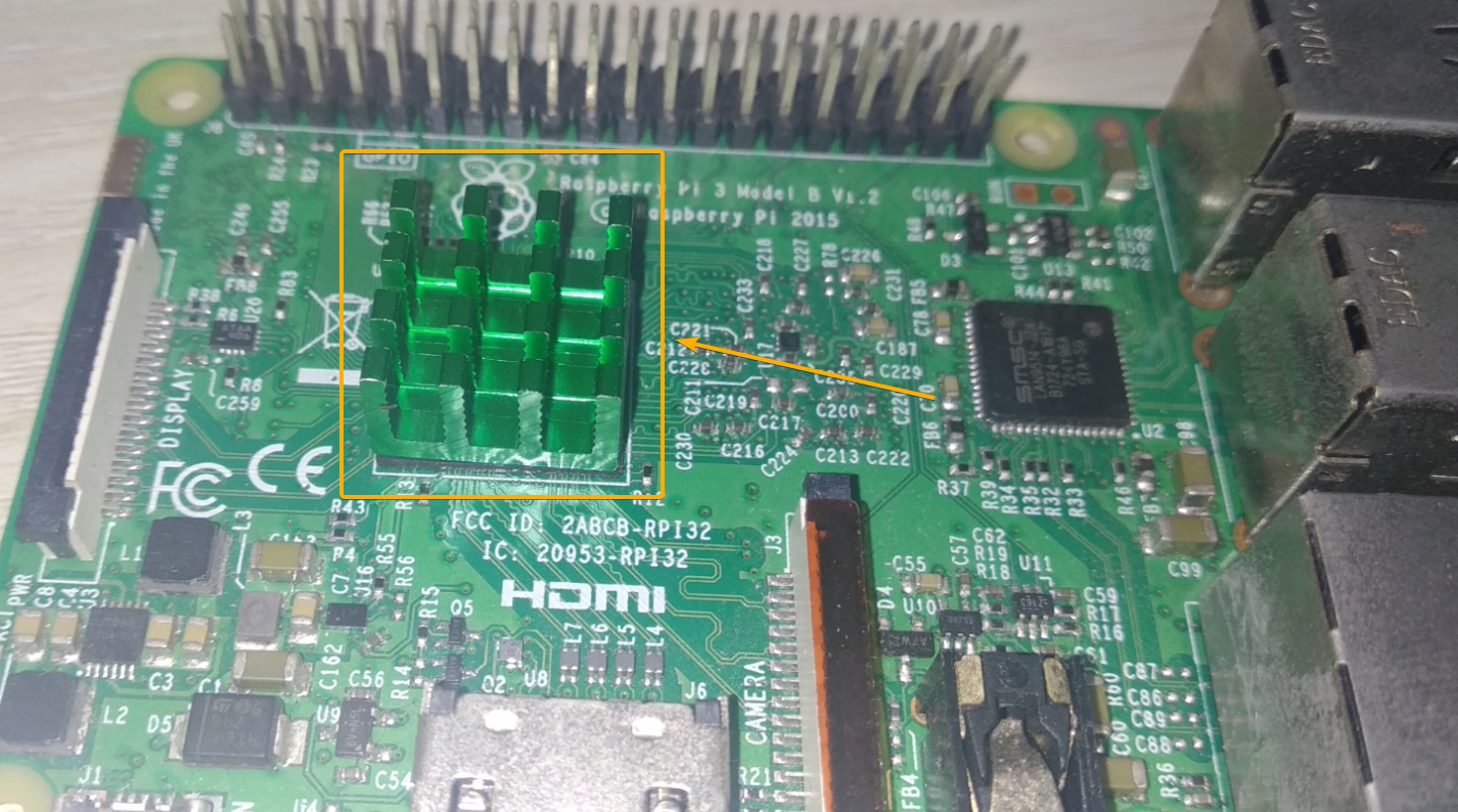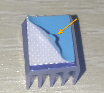 Put the heat sink (with the thin blue film removed) on the correct chip of your Raspberry Pi.