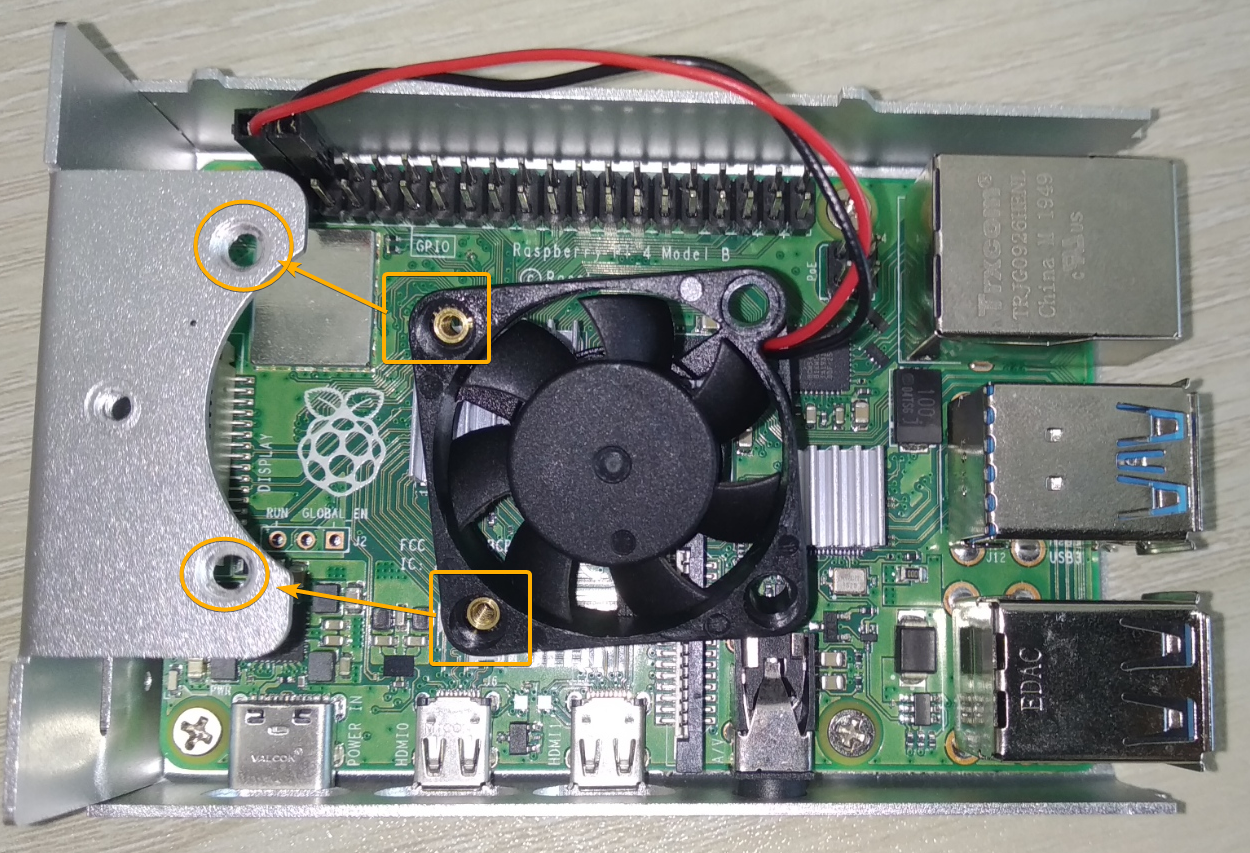 Once the fan wires are connected to your Raspberry Pi, you have to attach the fan to the case. In this particular Raspberry Pi 4 case, the two fan screw holes should go below the two holes of the case, as shown in the image below.