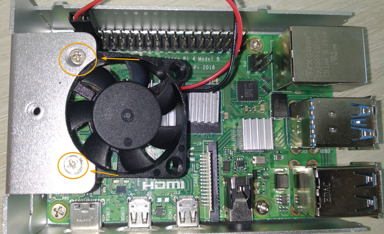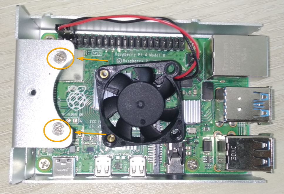 Put the two long screws (they usually come with your fan) in the hole of the Raspberry Pi case and align the fan screw holes with the case holes.