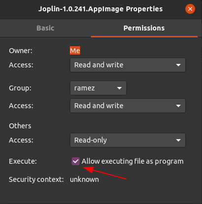 Next, go to the directory where it was downloaded and right-click on it. Over here, open the permissions tab and tick the checkbox next to Execute.