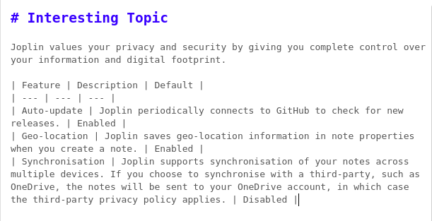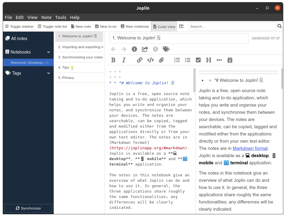 Joplin allows users to have multiple notebooks which themselves can have subnotebooks and multiple notes inside them. The interesting about Joplin is that notes are written using the Markdown language as seen in the image below: