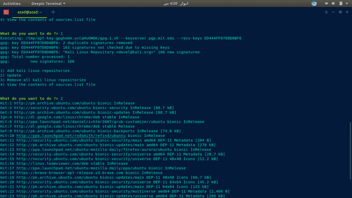 The above option will automatically add Kali’s repositories to your “sources.list” file located in “/etc/apt” directory, so you won’t have to do it manually. Now type 2 to update your system with Kali repositories.