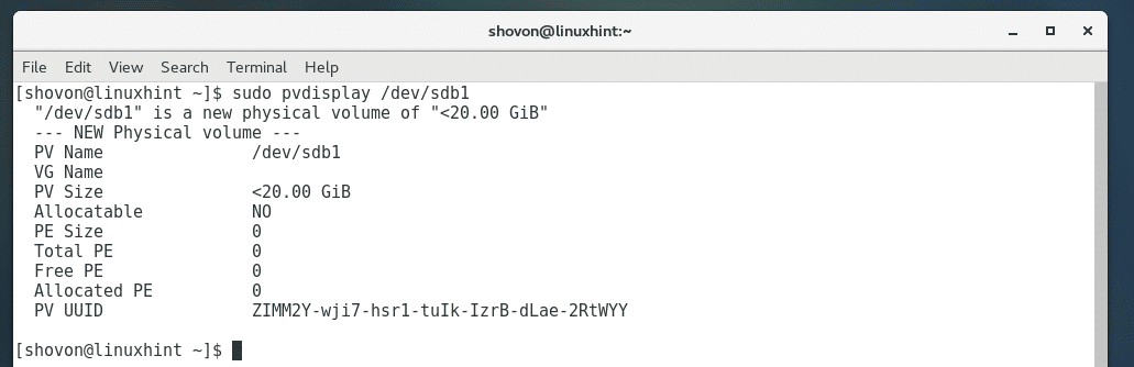 If you want to display more information about any specific PV, let’s say /dev/sdb1, then run the following command: